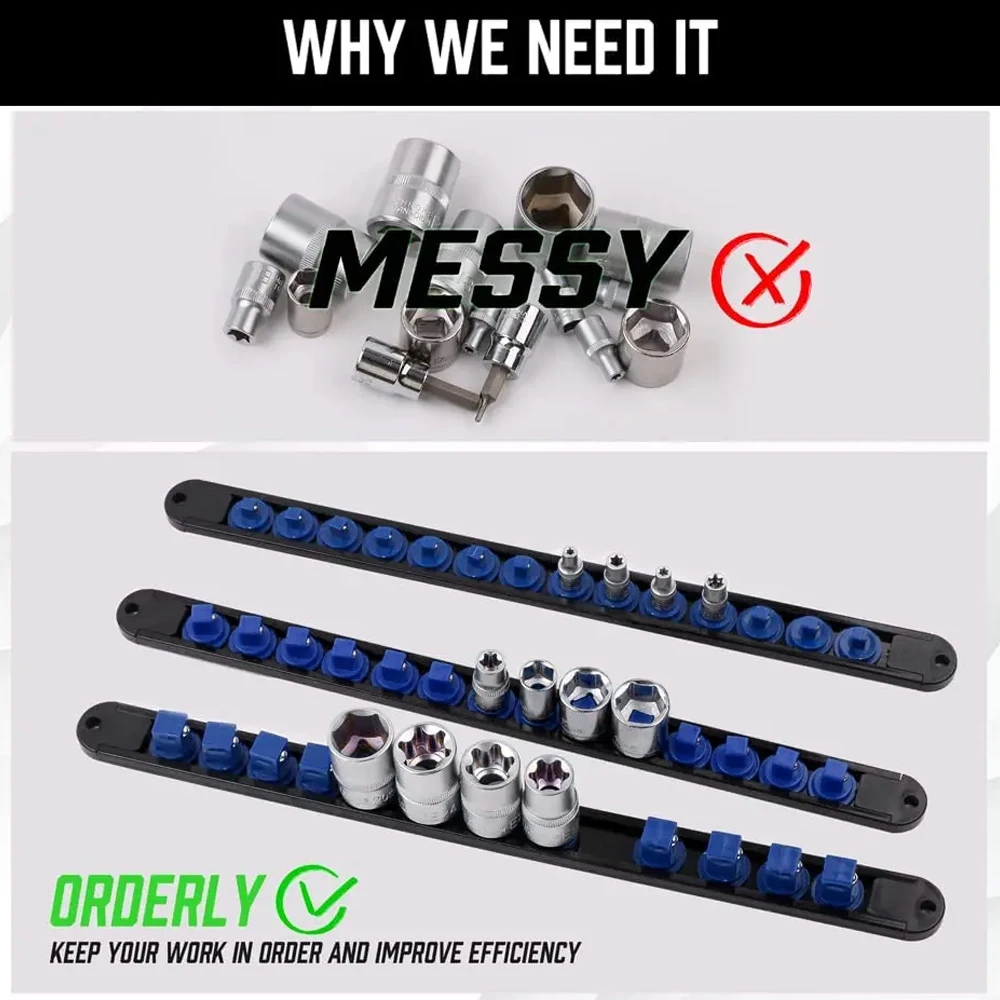 Keep your sockets neatly organized with this 360° Swivel Socket Organizer Rail. Designed to hold 1/4″, 3/8″, and 1/2″ drive sockets, it provides a secure and efficient storage solution for any toolbox or workshop. Each clip swivels 360 degrees, allowing easy access and visibility to your tools. Made from premium quality materials, it ensures long-lasting durability and resistance to wear. The secure locking clips keep sockets firmly in place, preventing loss or slipping. Its compact and lightweight design saves space while keeping your tools easily accessible. Perfect for mechanics, technicians, and DIY enthusiasts. Suitable for both professional garages and home workshops. Quickly organize, store, and retrieve your sockets with ease. Simplify your workspace with this durable and flexible Socket Organizer Rail.