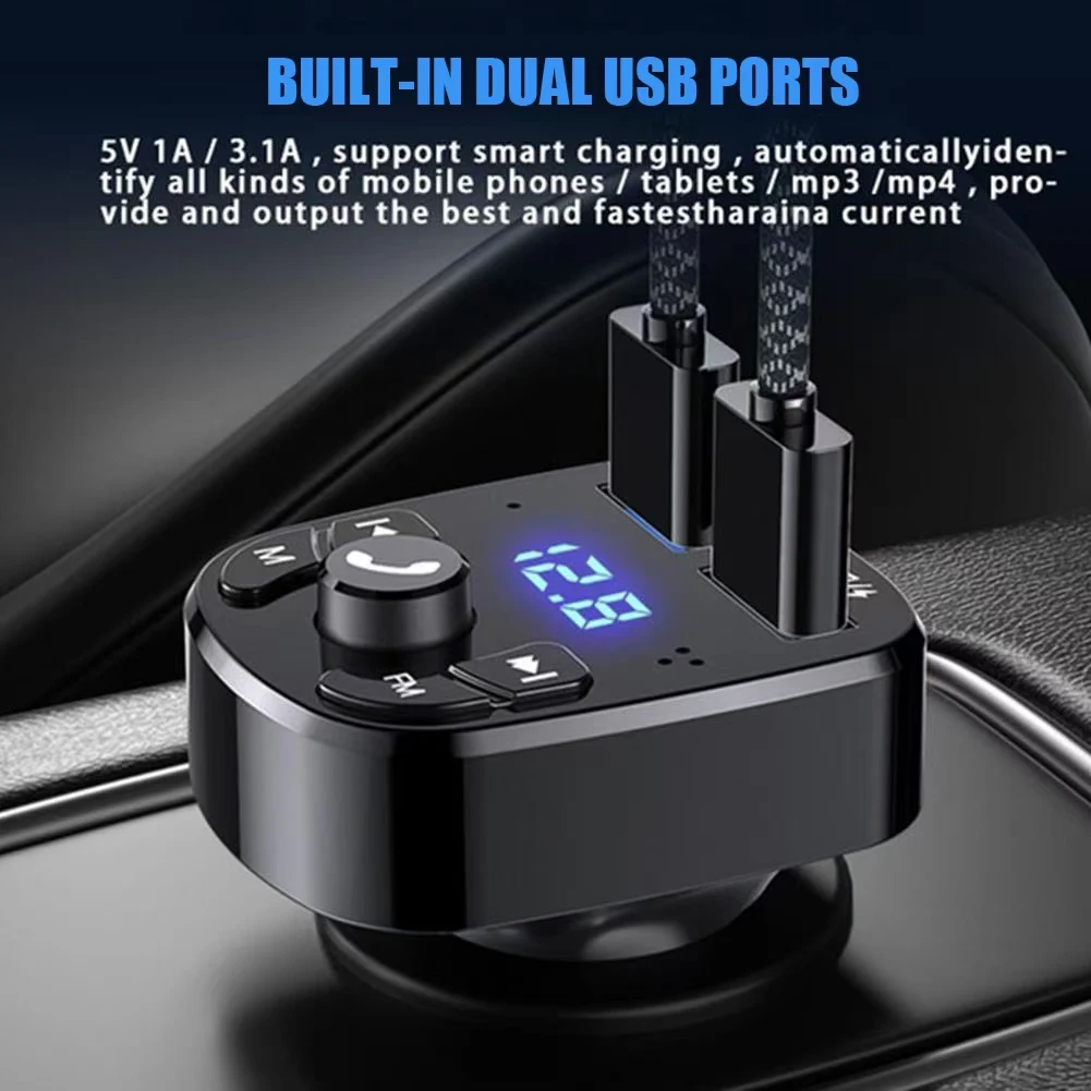 Upgrade your driving experience with this Bluetooth 5.0 hands-free FM transmitter. It connects your phone to your car stereo, letting you stream music, take calls, and play MP3s with ease. Equipped with dual USB ports for fast charging, it powers up your devices while on the road. Clear FM signal and noise reduction ensure high-quality sound. Compact and easy to install, just plug into the cigarette lighter socket. A multifunctional car accessory for safe, convenient, and enjoyable drives.
