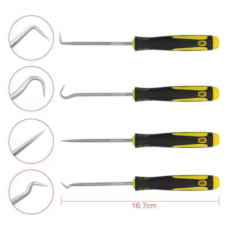 This 4-piece Long Pick & Hook Set is designed for easy removal of gaskets, oil seals, and O-rings. The extended length provides extra reach for accessing tight or recessed areas. Each pick features a different hook shape for versatile application. Made from hardened steel, the tools offer strength and durability for repeated use. Precision tips help remove seals without damaging surrounding components. Ergonomic handles ensure comfort and control during detailed work. Ideal for automotive, mechanical, and maintenance repairs. Suitable for professional mechanics and DIY enthusiasts. Compact and lightweight for convenient storage in any toolbox. Upgrade your repair toolkit with this reliable gasket and seal removal pick set.
